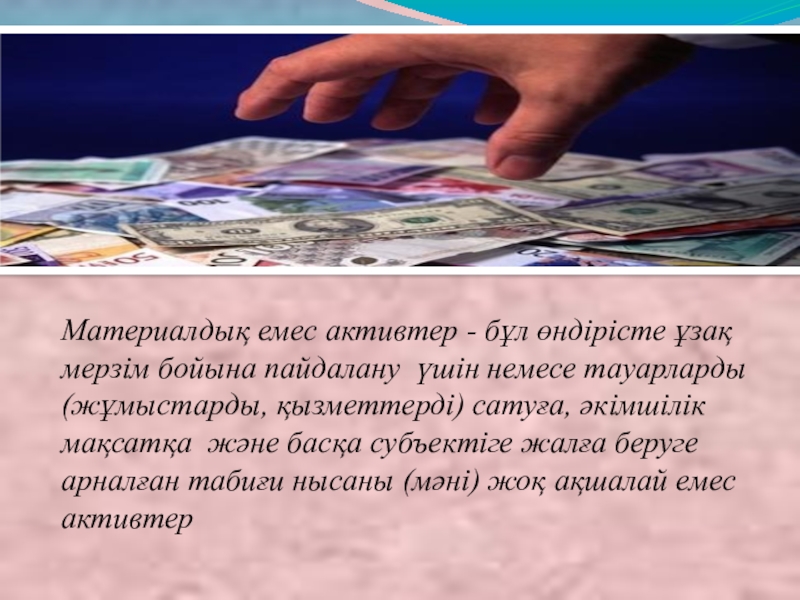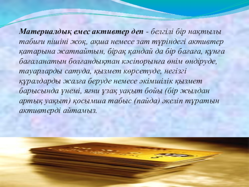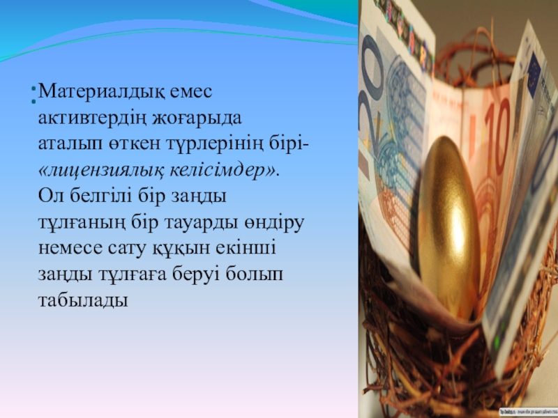 "Интеллектуалдық меншік" ұғымынша: авторлық құқықтары, орындаушы- артистердің қызметіне қатысты құқықтары (дыбысын жазуға, радио және телехабарларға байланысты хабар беруге), ойлап табушылық патент кұқықтары, ғылыми жаңалық ашу құқықтары, өнеркәсіптік үлгілер, тауар белгілері, т.б. интеллектуалдық меншік түрлері жатады