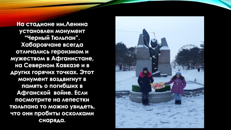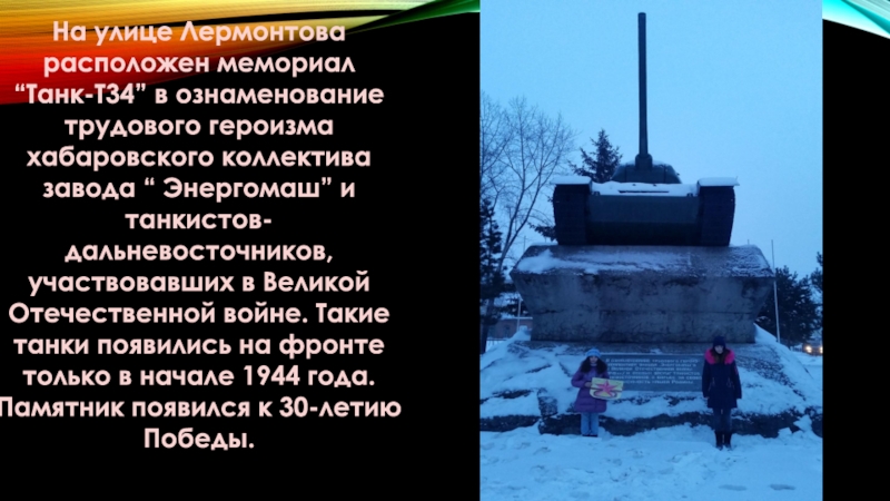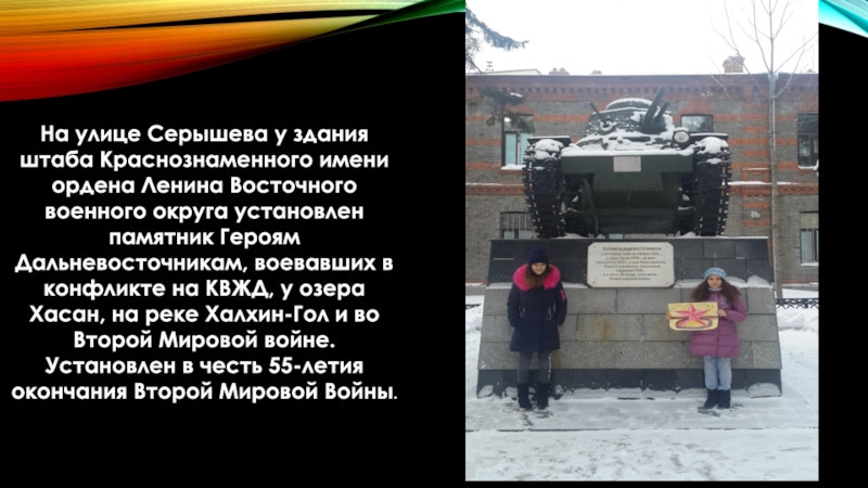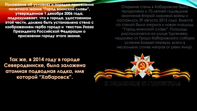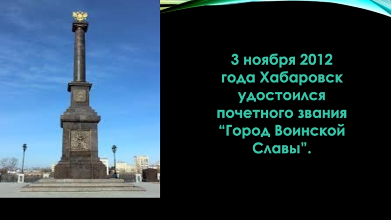 Открытие стелы в Хабаровске было приурочено к 70-летней годовщине окончания Второй мировой войны и состоялось 29 августа 2015 года. Вместе со стелой была открыта и новая площадь “Город воинской славы”. Площадь располагается на улице Тургенева, недалеко от Градо-Хабаровского собора успения Божьей Матери, всего в нескольких сотнях метров от реки Амур.