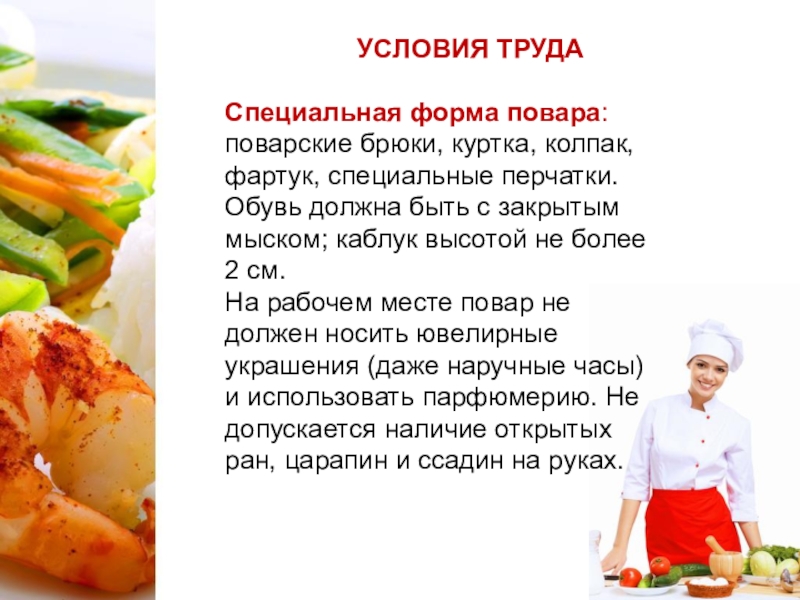 Специальная форма повара: поварские брюки, куртка, колпак, фартук, специальные перчатки.