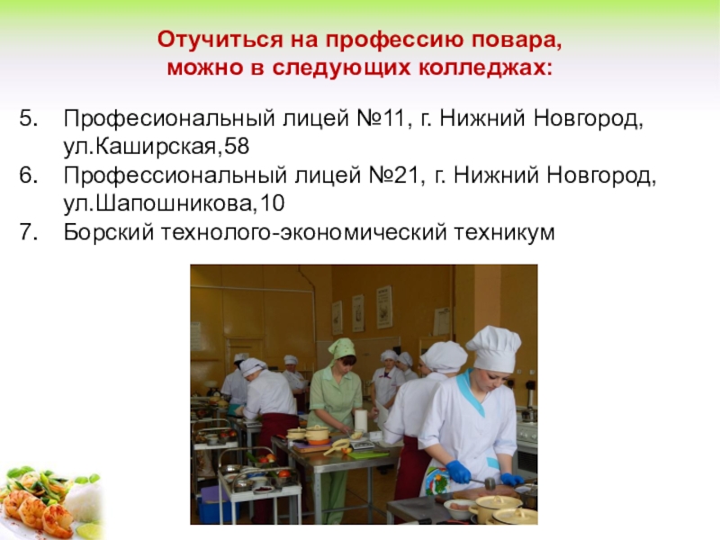 в ней есть место фантазии и изобретательности. У хороших поваров высокий уровень оплаты труда. Кроме того, и для повседневной семейной жизни профессиональные умения очень пригодятся, чтобы побаловать домашних интересными блюдами.