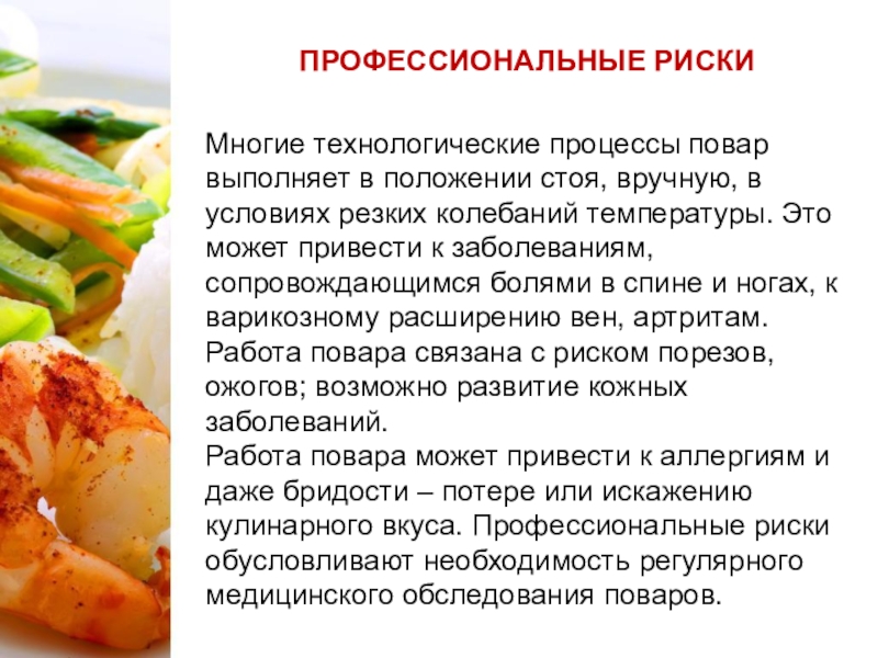 Работа повара связана с риском порезов, ожогов; возможно развитие кожных заболеваний.