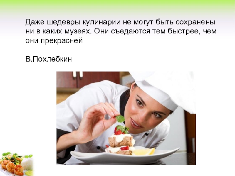 Слайд 12Даже шедевры кулинарии не могут быть сохранены ни в каких музеях.