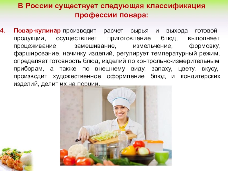 продукции, осуществляет приготовление блюд, выполняет процеживание, замешивание, измельчение, формовку, фарширование, начинку изделий, регулирует температурный режим, определяет готовность блюд, изделий по контрольно-измерительным приборам, а также по внешнему виду, запаху, цвету, вкусу, производит художественное оформление блюд и кондитерских изделий, делит их на порции.