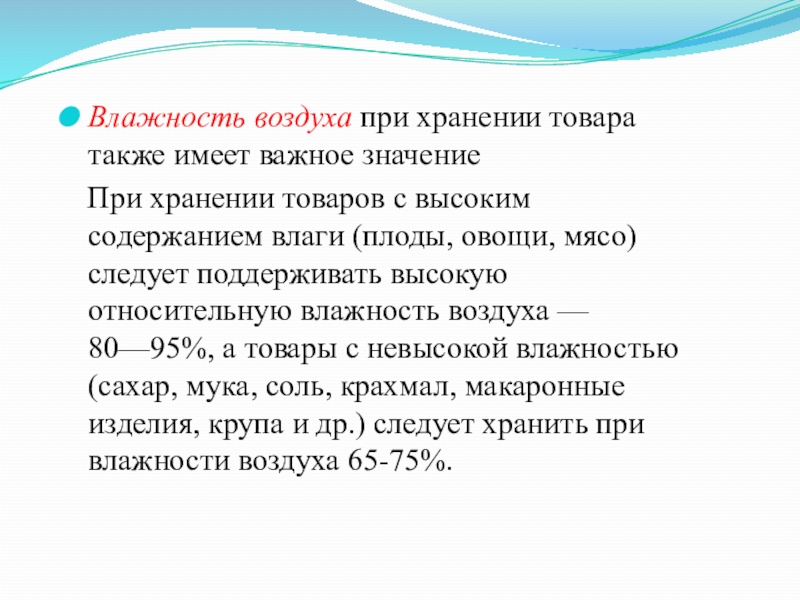 Слайд 12Влажность воздуха при хранении товара также имеет важное значение