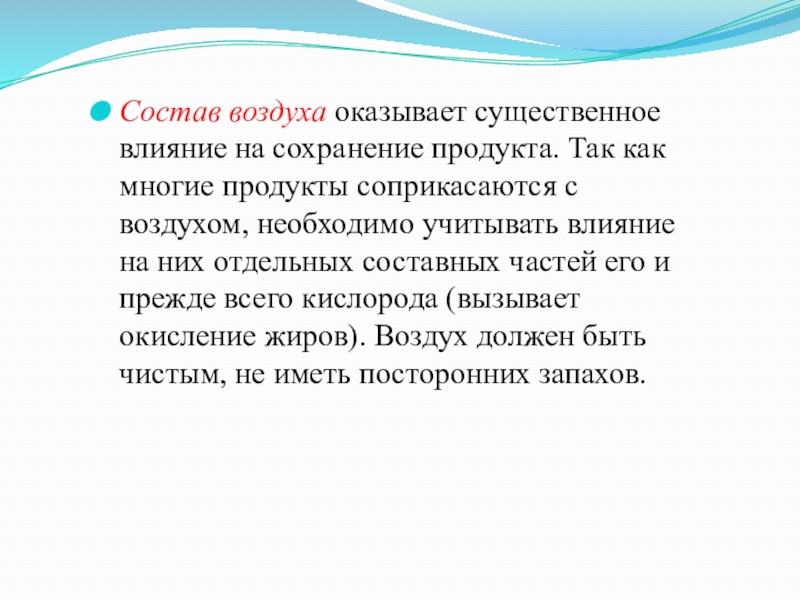 Слайд 13Состав воздуха оказывает существенное влияние на сохранение продукта. Так как многие продукты