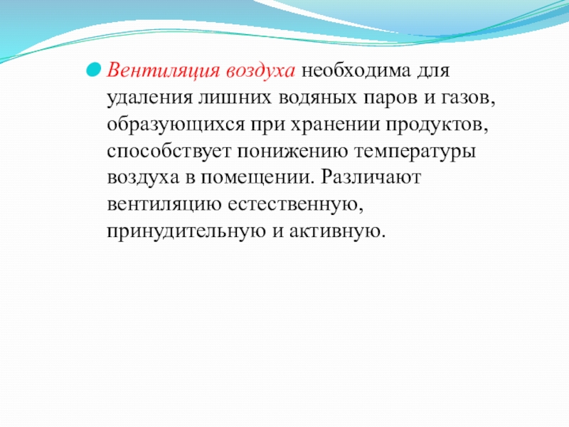 хранении продуктов, способствует понижению температуры воздуха в помещении. Различают вентиляцию естественную, принудительную и активную.