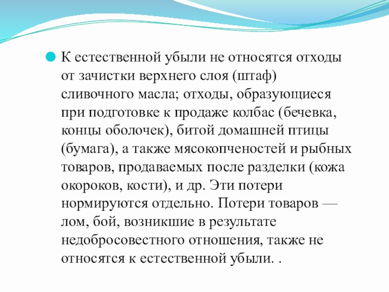 сливочного масла; отходы, образующиеся при подготовке к продаже колбас (бечевка, концы оболочек), битой домашней птицы (бумага), а также мясокопченостей и рыбных товаров, продаваемых после разделки (кожа окороков, кости), и др. Эти потери нормируются отдельно. Потери товаров — лом, бой, возникшие в результате недобросовестного отношения, также не относятся к естественной убыли. .