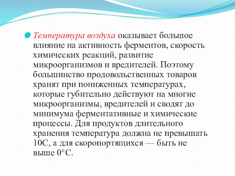 развитие микроорганизмов и вредителей. Поэтому большинство продовольственных товаров хранят при пониженных температурах, которые губительно действуют на многие микроорганизмы, вредителей и сводят до минимума ферментативные и химические процессы. Для продуктов длительного хранения температура должна не превышать 10C, а для скоропортящихся — быть не выше 0°С.