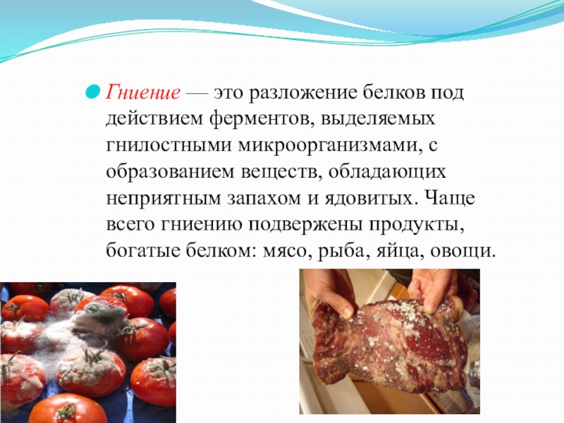 образованием веществ, обладающих неприятным запахом и ядовитых. Чаще всего гниению подвержены продукты, богатые белком: мясо, рыба, яйца, овощи.