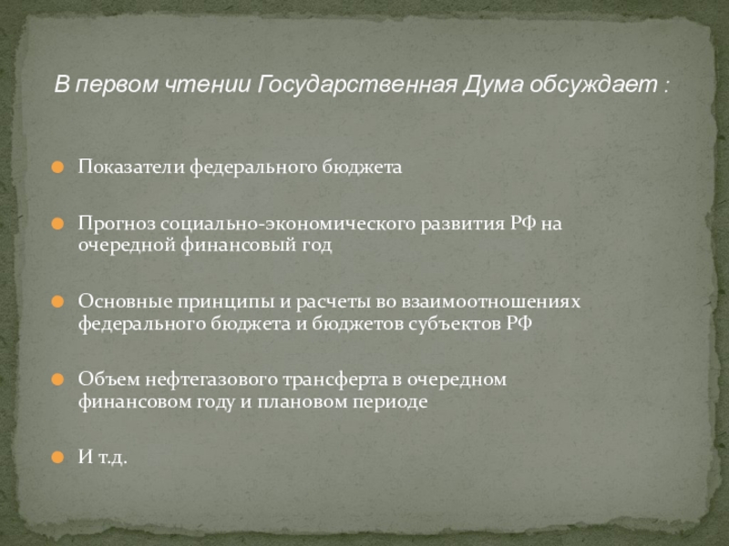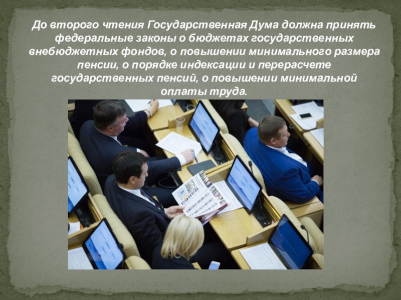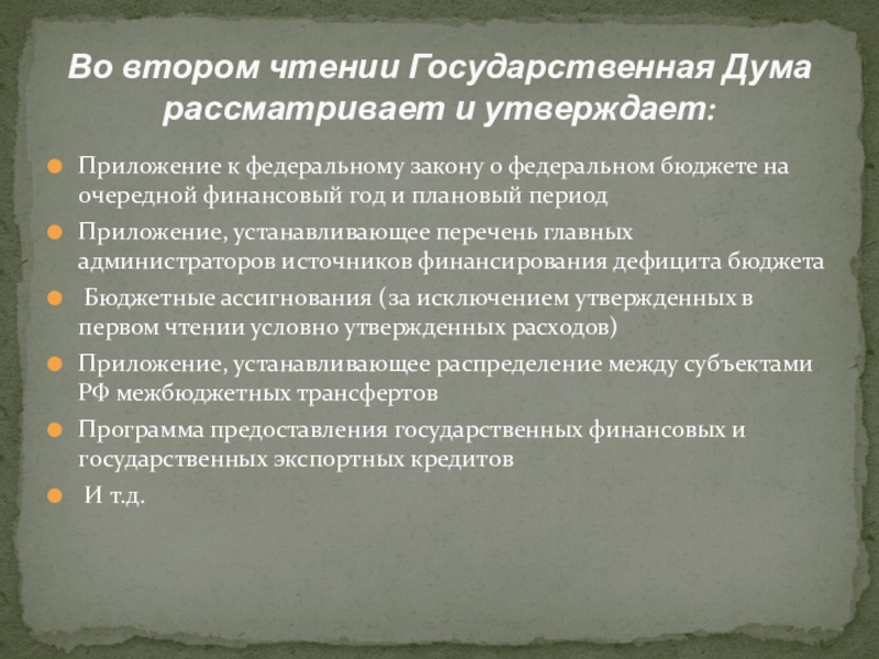 Во втором чтении Государственная Дума рассматривает и утверждает: