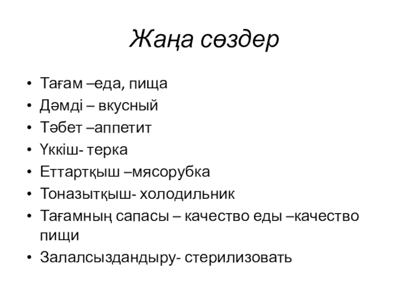 Жаңа сөздерТағам –еда, пищаДәмді – вкусныйТәбет –аппетитҮккіш- теркаЕттартқыш –мясорубкаТоназытқыш- холодильникТағамның сапасы – качество еды –качество пищиЗалалсыздандыру- стерилизовать