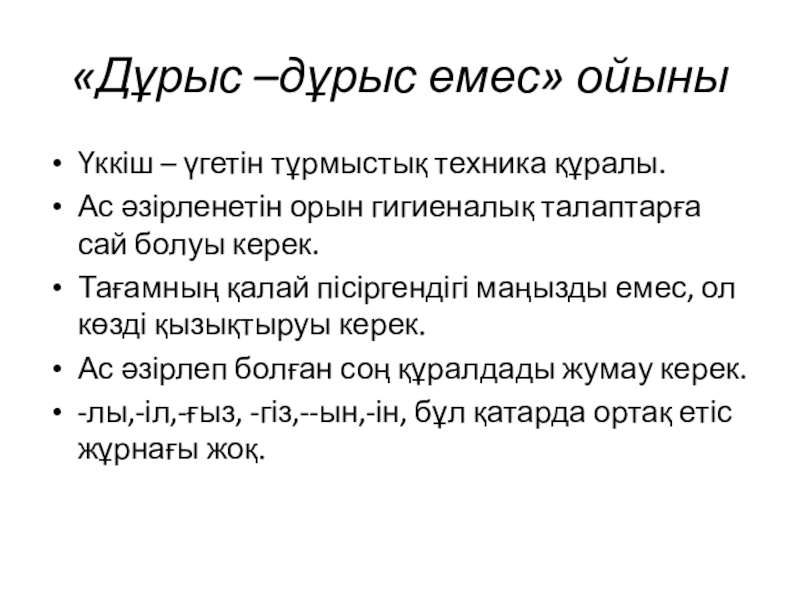 «Дұрыс –дұрыс емес» ойыныҮккіш – үгетін тұрмыстық техника құралы.Ас әзірленетін орын гигиеналық талаптарға сай болуы керек.Тағамның қалай