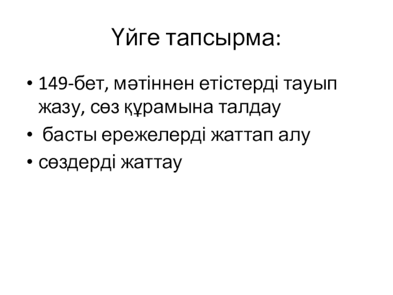 Үйге тапсырма:149-бет, мәтіннен етістерді тауып жазу, сөз құрамына талдау басты ережелерді жаттап алусөздерді жаттау