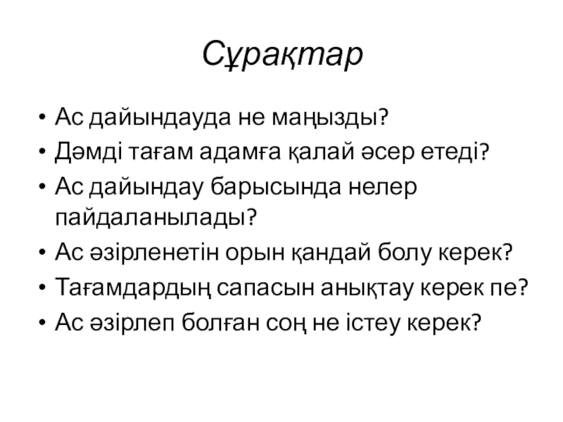 СұрақтарАс дайындауда не маңызды?Дәмді тағам адамға қалай әсер етеді?Ас дайындау барысында нелер пайдаланылады?Ас әзірленетін орын қандай болу
