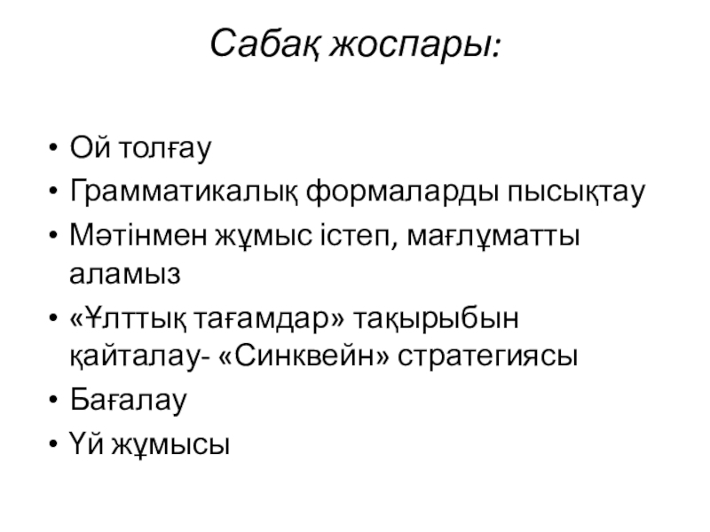 Сабақ жоспары: Ой толғауГрамматикалық формаларды пысықтауМәтінмен жұмыс істеп, мағлұматты аламыз«Ұлттық тағамдар» тақырыбын қайталау- «Синквейн» стратегиясыБағалауҮй жұмысы
