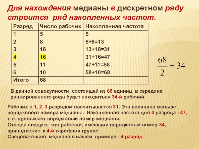 В данной совокупности, состоящей из 68 единиц, в середине ранжированного ряда будет находиться 34-й рабочий