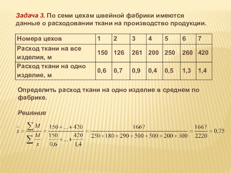 Определить расход ткани на одно изделие в среднем по фабрике.