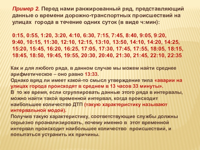 Однако вряд ли имеет какой-то смысл утверждение типа «аварии на улицах города происходят в среднем в 13 часов 33 минуты».