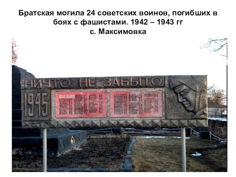 Слайд 26Братская могила 24 советских воинов, погибших в боях с фашистами. 1942