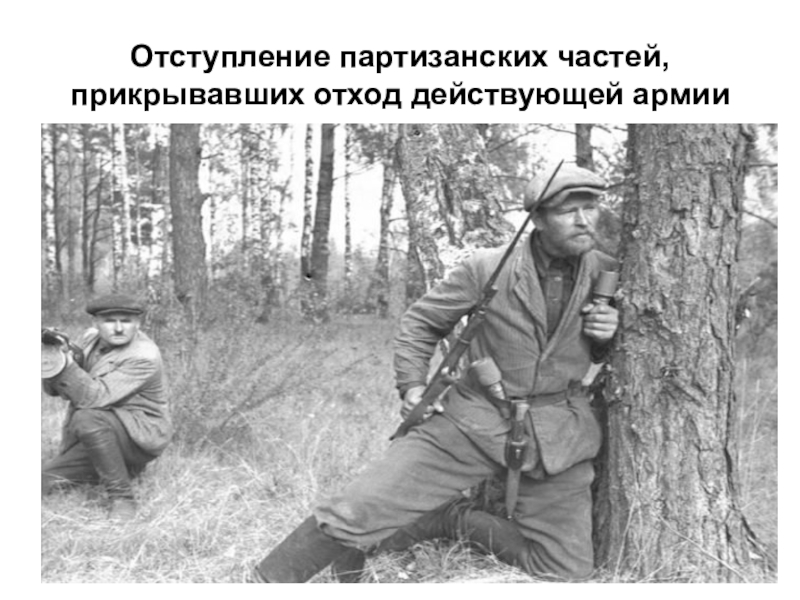 Слайд 4Отступление партизанских частей, прикрывавших отход действующей армии