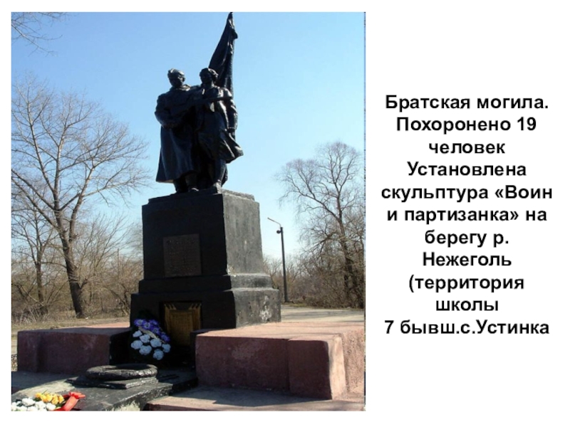 Слайд 31Братская могила.Похоронено 19 человек Установлена скульптура «Воин и партизанка» на берегу р.Нежеголь