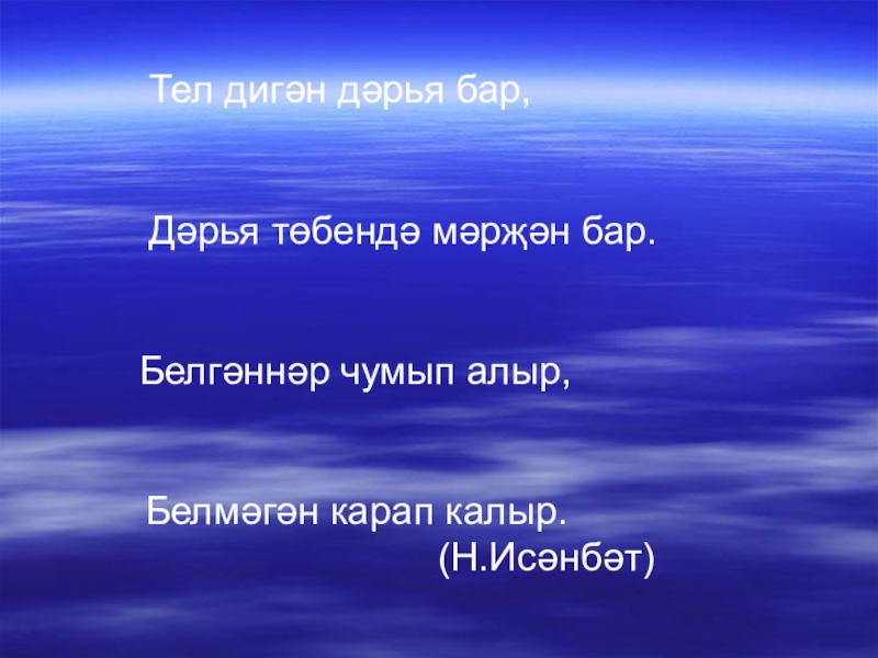 Тел дигән дәрья бар, Дәрья төбендә мәрҗән бар.Белгәннәр чумып алыр, Белмәгән карап калыр.