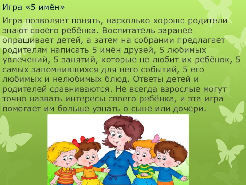 Воспитатель заранее опрашивает детей, а затем на собрании предлагает родителям написать 5 имён друзей, 5 любимых увлечений, 5 занятий, которые не любит их ребёнок, 5 самых запомнившихся для него событий, 5 его любимых и нелюбимых блюд. Ответы детей и родителей сравниваются. Не всегда взрослые могут точно назвать интересы своего ребёнка, и эта игра помогает им больше узнать о сыне или дочери.