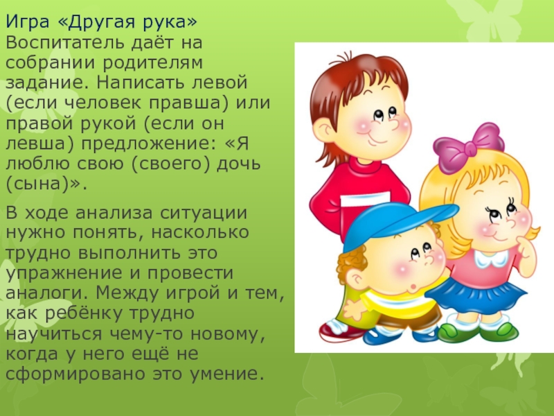Воспитатель даёт на собрании родителям задание. Написать левой (если