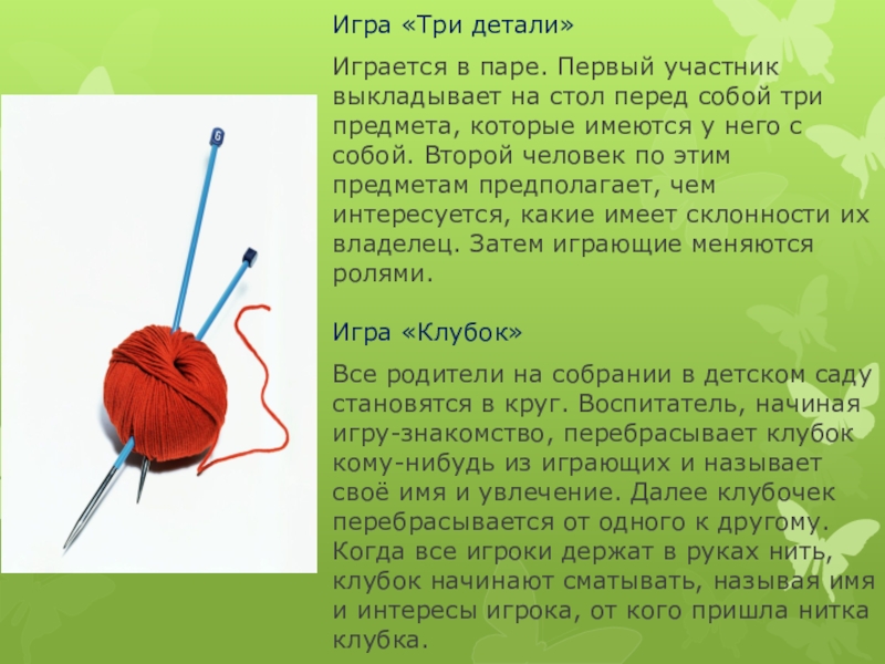 Все родители на собрании в детском саду становятся в круг. Воспитатель, начиная игру-знакомство, перебрасывает клубок кому-нибудь из играющих и называет своё имя и увлечение. Далее клубочек перебрасывается от одного к другому. Когда все игроки держат в руках нить, клубок начинают сматывать, называя имя и интересы игрока, от кого пришла нитка клубка.