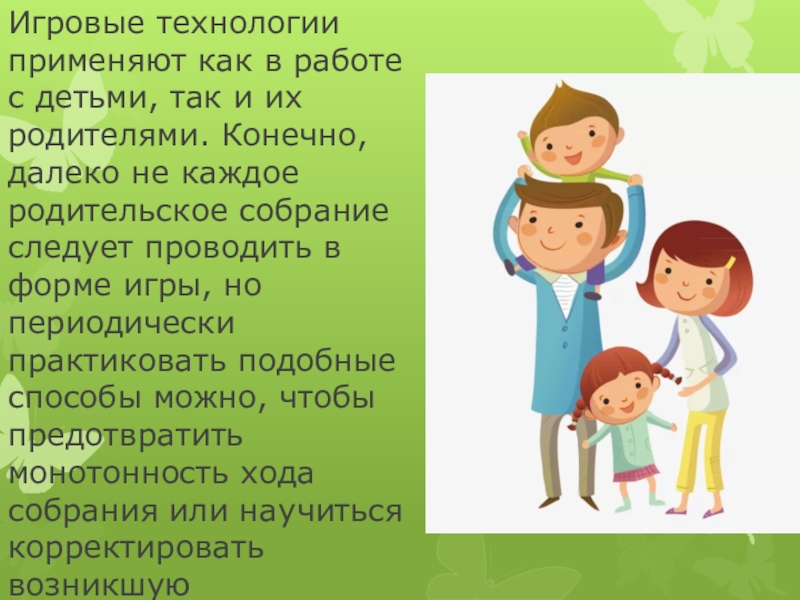 родителями. Конечно, далеко не каждое родительское собрание следует проводить в форме игры, но периодически практиковать подобные способы можно, чтобы предотвратить монотонность хода собрания или научиться корректировать возникшую поведенческую проблему детей/родителей.