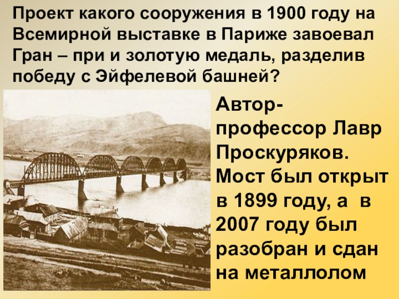 Автор- профессор Лавр Проскуряков. Мост был открыт в 1899 году, а в 2007 году был разобран и сдан на металлолом