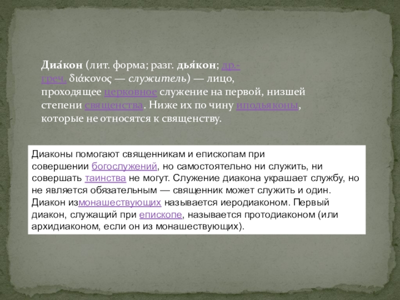Диаконы помогают священникам и епископам при совершении богослужений, но самостоятельно ни служить, ни совершать таинства не могут. Служение диакона украшает службу, но не является обязательным — священник может служить и один. Диакон измонашествующих называется иеродиаконом. Первый диакон, служащий при епископе, называется протодиаконом (или архидиаконом, если он из монашествующих).