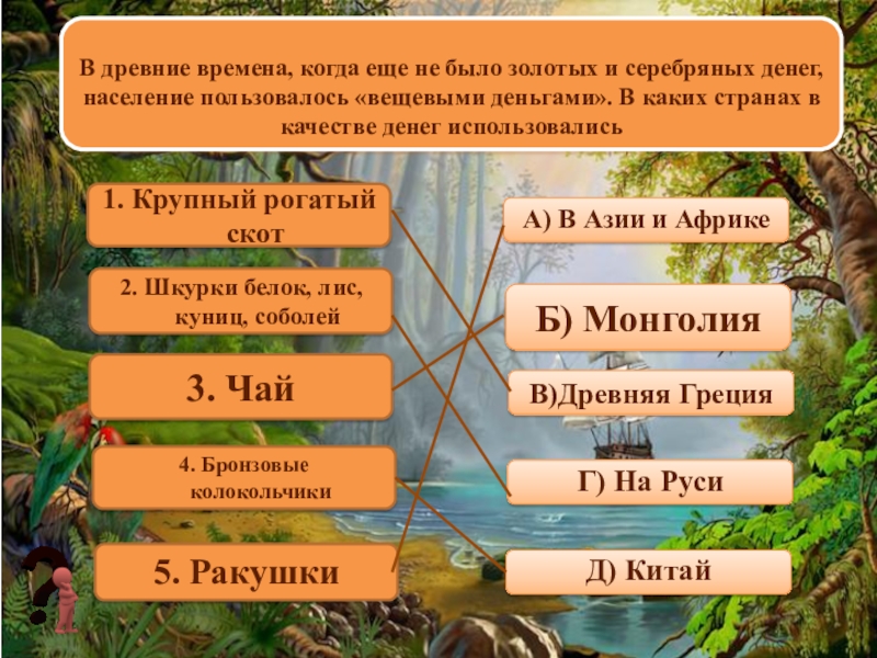 В древние времена, когда еще не было золотых и серебряных денег, население пользовалось «вещевыми деньгами». В каких странах в качестве денег использовались