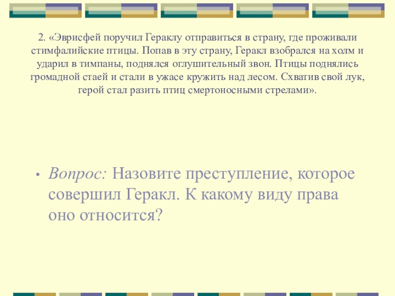 Вопрос: Назовите преступление, которое совершил Геракл. К какому виду права оно относится?