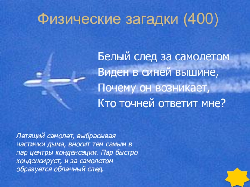 Летящий самолет, выбрасывая частички дыма, вносит тем самым в пар центры конденсации. Пар быстро конденсирует, и за самолетом образуется облачный след.