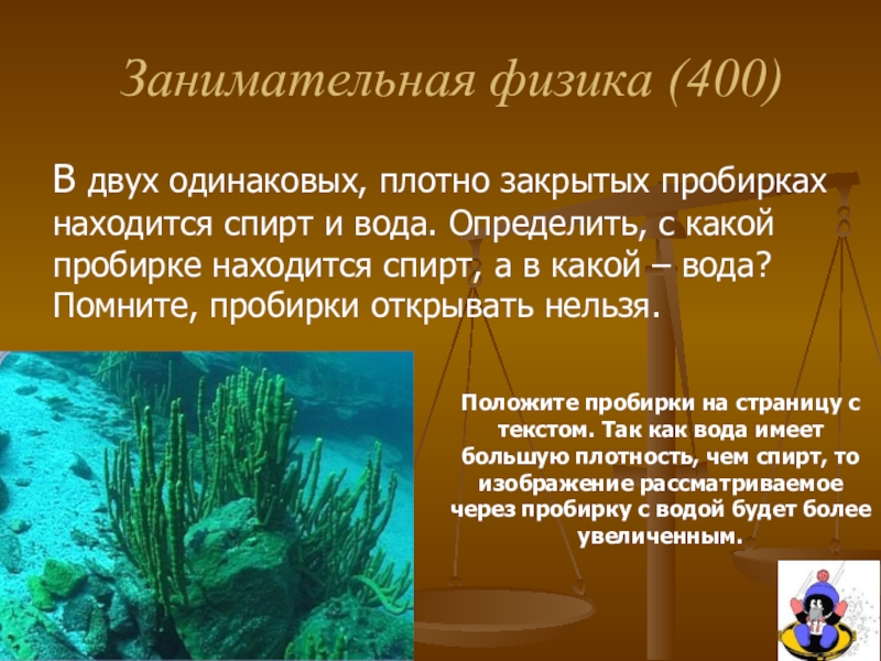 Положите пробирки на страницу с текстом. Так как вода имеет большую плотность, чем спирт, то изображение рассматриваемое через пробирку с водой будет более увеличенным.