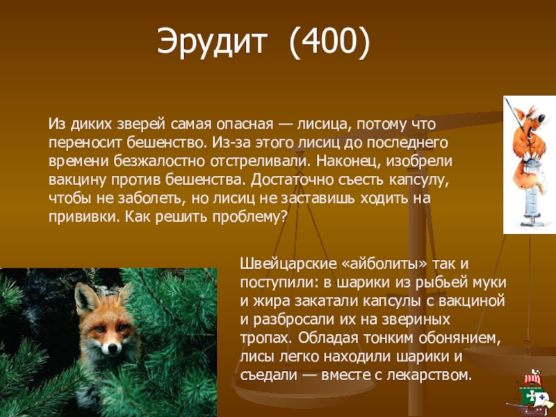 Швейцарские «айболиты» так и поступили: в шарики из рыбьей муки и жира закатали капсулы с вакциной и разбросали их на звериных тропах. Обладая тонким обонянием, лисы легко находили шарики и съедали — вместе с лекарством.