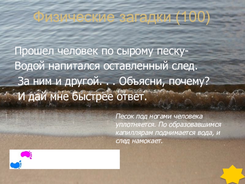 Песок под ногами человека уплотняется. По образовавшимся капиллярам поднимается вода, и след намокает.