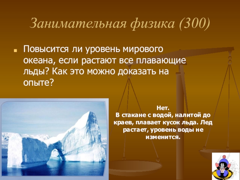 В стакане с водой, налитой до краев, плавает кусок льда. Лед растает, уровень воды не изменится.