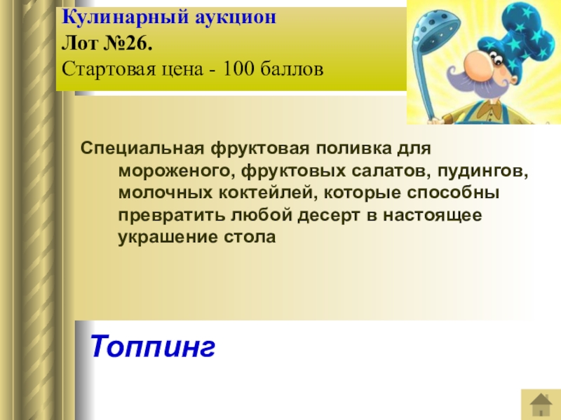 Натуральные плоды и ягоды, компоты, кисели, желе, муссы и кремы, мороженое, парфе.