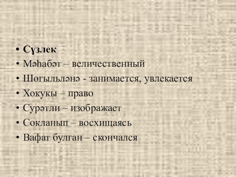 Сүзлек Мәһабәт – величественныйШөгыльләнә - занимается, увлекаетсяХокукы – правоСурәтли – изображаетСокланып – восхищаясьВафат булган – скончался