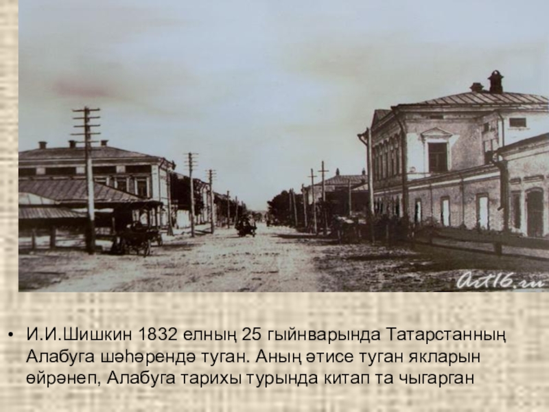 И.И.Шишкин 1832 елның 25 гыйнварында Татарстанның Алабуга шәһәрендә туган. Аның әтисе туган якларын өйрәнеп, Алабуга тарихы