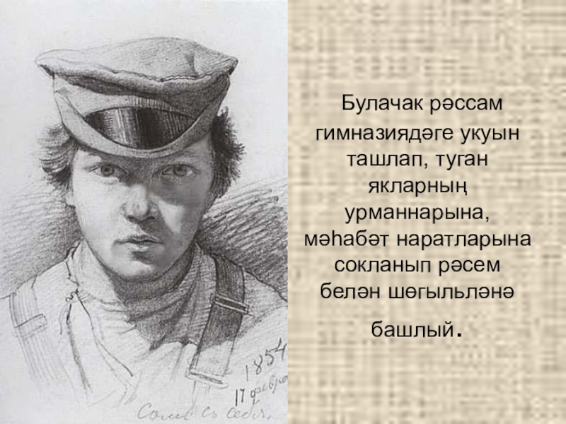 Слайд 4 Булачак рәссам гимназиядәге укуын ташлап, туган якларның урманнарына, мәһабәт наратларына