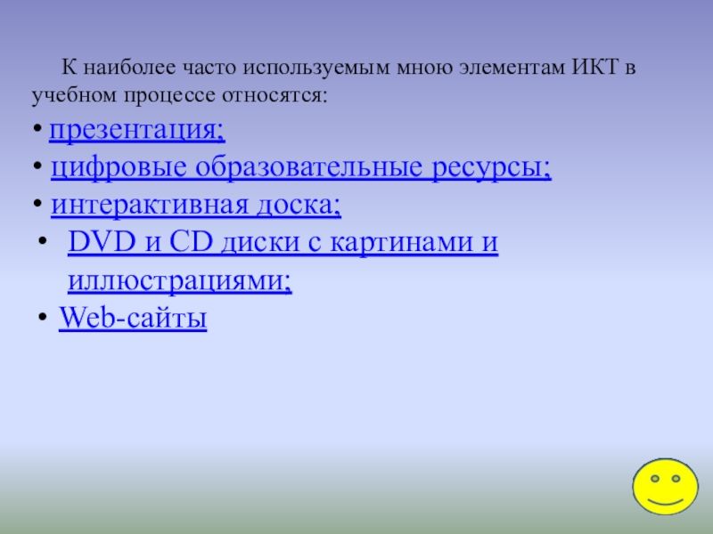 Слайд 6 К наиболее часто используемым мною элементам ИКТ в