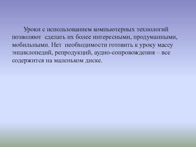 их более интересными, продуманными, мобильными. Нет необходимости готовить к уроку массу энциклопедий, репродукций, аудио-сопровождения – все содержится на маленьком диске.