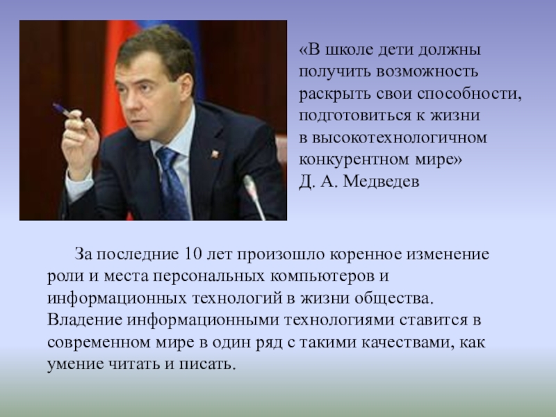 За последние 10 лет произошло коренное изменение роли и места персональных компьютеров и информационных технологий в жизни общества. Владение информационными технологиями ставится в современном мире в один ряд с такими качествами, как умение читать и писать.
