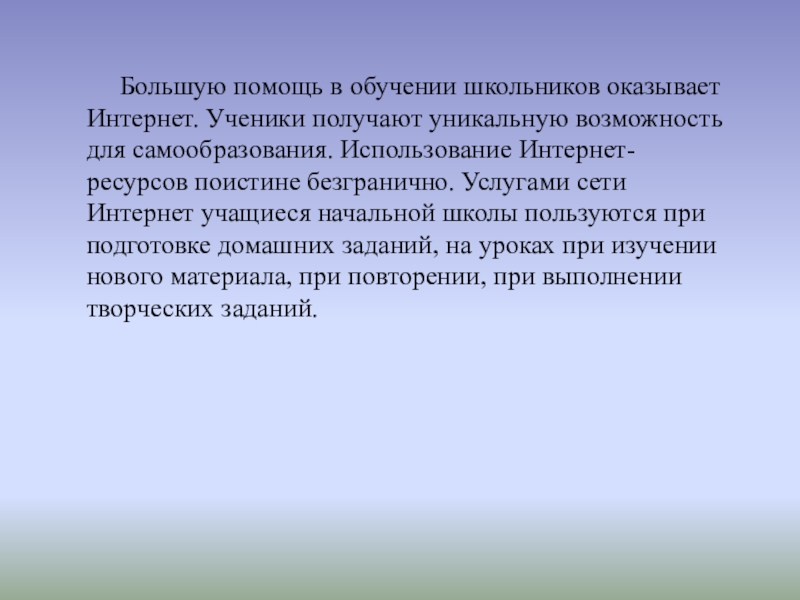 получают уникальную возможность для самообразования. Использование Интернет-ресурсов поистине безгранично. Услугами сети Интернет учащиеся начальной школы пользуются при подготовке домашних заданий, на уроках при изучении нового материала, при повторении, при выполнении творческих заданий.