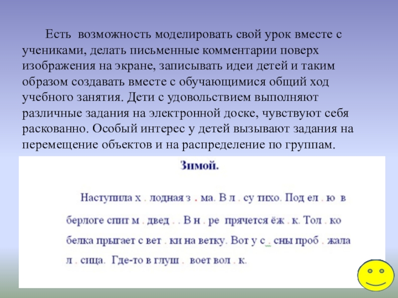учениками, делать письменные комментарии поверх изображения на экране, записывать идеи детей и таким образом создавать вместе с обучающимися общий ход учебного занятия. Дети с удовольствием выполняют различные задания на электронной доске, чувствуют себя раскованно. Особый интерес у детей вызывают задания на перемещение объектов и на распределение по группам.