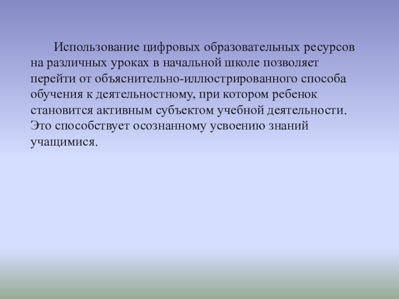 в начальной школе позволяет перейти от объяснительно-иллюстрированного способа обучения к деятельностному, при котором ребенок становится активным субъектом учебной деятельности. Это способствует осознанному усвоению знаний учащимися.