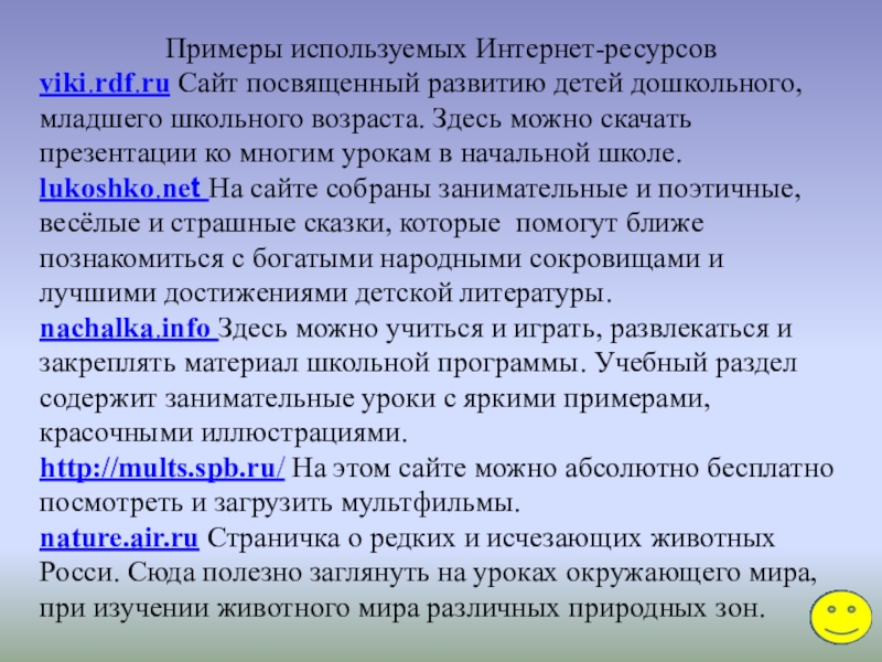 nachalka.info Здесь можно учиться и играть, развлекаться и закреплять материал школьной программы. Учебный раздел содержит занимательные уроки с яркими примерами, красочными иллюстрациями.